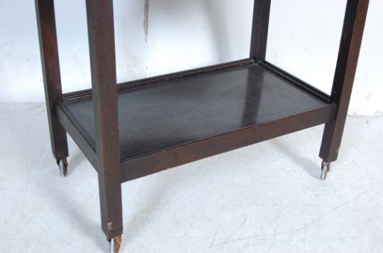 A vintage retro 20th century heavy oak two tier drinks cocktail trolley / serving trolley of a rectangular form with gallery trays and drop leaves, all raised on a quare frame with casters.