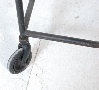 A 20th century circa 1940’s WWII / Second World War era wounded soldier walking support wheelchair / zimmer frame of a metallic construction having adjustable underarm supports with chrome metal handbrake leavers raised on two large wheels and a small caster wheel.