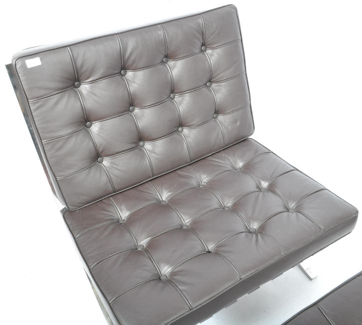 After Ludwig Mies Van der Rohe & Lilly Reich - Barcelona Chair & Footstool - A contemporary low easy / lounge chair / armchair and matching ottoman footstool having a chromed steel ' X ' frame with brown leather strapping and leather button backed cushions for backrest and seat. Measures: 75cm x 76cm x 77cm.