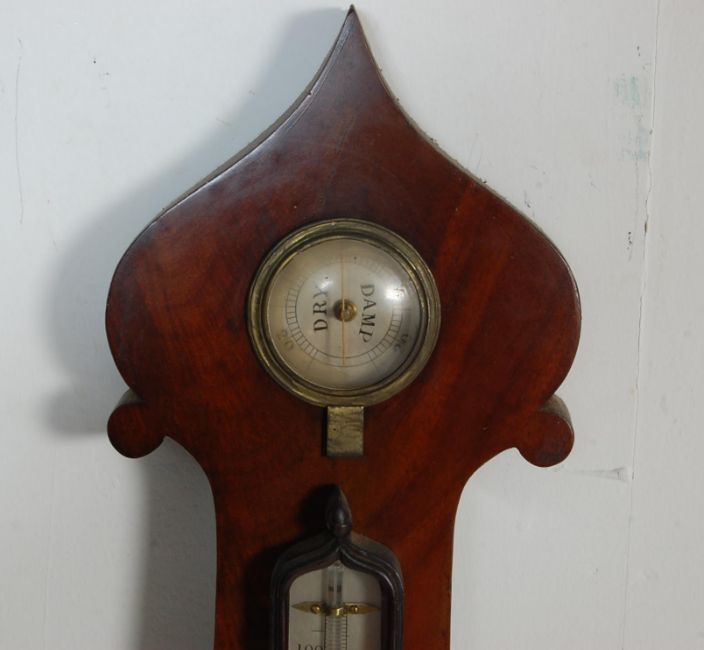 A 19th century Victorian mahogany wall mounted banjo barometer having a pointed top over a thermometer with a circular barometer gauge to the centre. Measures approx.: 106cm tall.