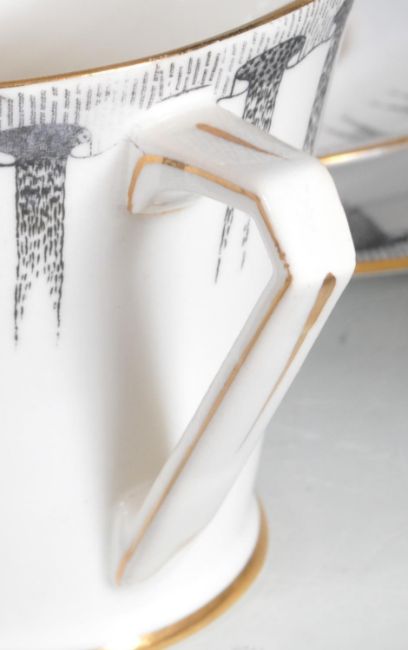 A vintage 20th century Corinth porcelain tea set comprising of cups, saucers, cake plates (trios) and creamer. The set has black geometric patterns to the rim with gilt embellishments.  Makers stamp to the base. Signs of wear and tear commensurate with its age.