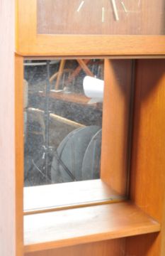 Westminster Clocks - Copenhagen - A retro vintage 20th Century 1970's Danish made longcase clock of upright pedestal form. The dial having baton hands to the clock face with fitted quartz movement with book / display shelves below. Measures approx  181cm x 43cm x 23cm.