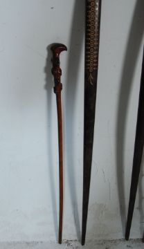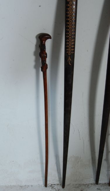 A pair of 20th century walking sticks together with a pair of carved native american eagle head axe shaped walking sticks. Measures 92cm tall.