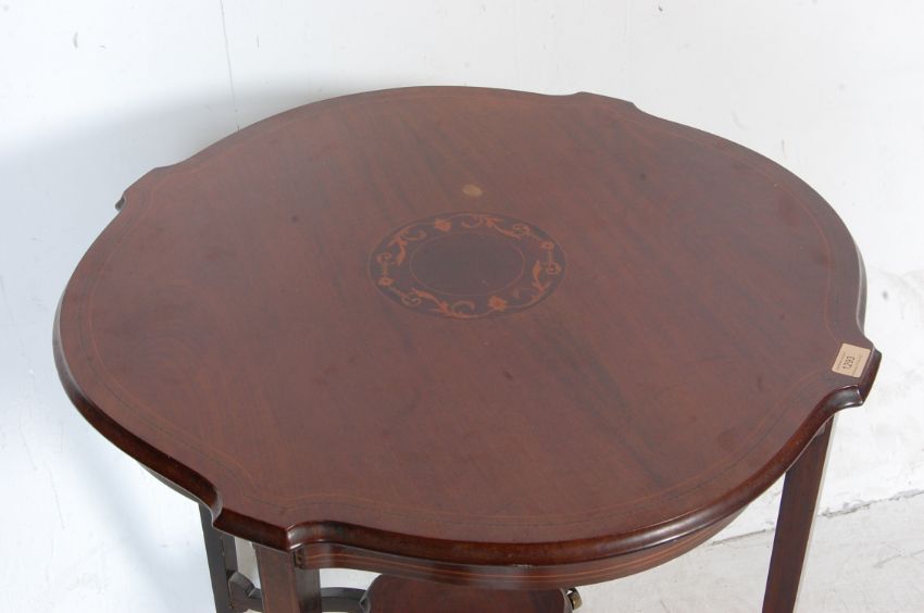 An Edwardian early 20th century inlaid mahogany window table / centre having central floral decoration raised on square tapering legs united by an undertray. Measures approx.: 71cm H x 69cm diameter.