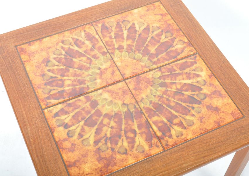 Toften Mobelfabrikken - An original retro vintage 1970's Danish teak wood tile top coffee table side occasional table having a sunburst inset tile top raised on teak surround square section legs. Stamped made in Denmark to underside. Measures approx; 40cm x 52cm x 52cm.