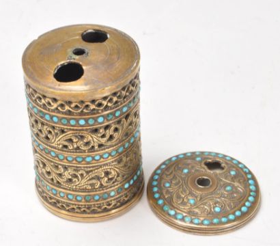 A silver collared M C Hersey & Son Ltd pepper grinder constructed from ebonised wood with a silver collar to the base (hallmarked London 2000) together with a brass engraved spice pot of cylindrical form set with turquoise cabochons. Pepper grinder measures 15cm tall.
