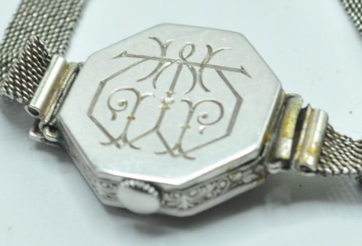 A 1920's / 1930's Art Deco ladies cocktail watch / wrist watch having a octagonal face the case being set with 32 round cut diamonds to the case with rectangular cut dark stones, with a further four round cut diamonds set to the bracelet attachment to the top (missing on the other side). Case tests as platinum, bracelet tests as 9ct gold, marked 9ct to the clasp. Movement marked 15 jewels, Fisher watch company. One dark stone missing, hinge cover missing to the bottom of the watch, some glue from a previous repair to the bottom of the watch. Total weight 19.2g.