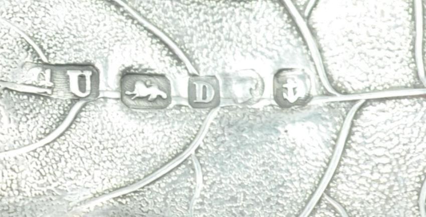 A 19th Century Victorian silver hallmarked caddy spoon in the form of a vine leaf with a moulded handle. Hallmarked Birmingham 1852. Makers marks for George Unite. Weight 9.9g. Measures 3.5 inches wide. Good condition, some slight obscurance to the makers mark.
