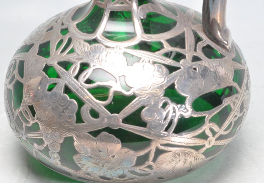 An early 20th Century Loetz Art Nouveau green glass and silver overlay jug having a bulbous body with pierced vine leaf silver overlay and pierced details to the neck, the faceted stopper also with silver overlay. Unmarked. Measures 28cm tall.