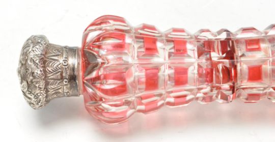 A 19th Century Victorian silver and flash glass double ended scent bottle having a faceted ruby glass body with silver repousse decorated lids to either end. Measures 14cm wide.