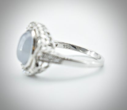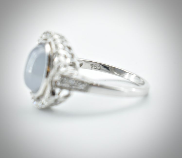 An 18ct gold sapphire and diamond ring. The ring set with a pale blue star sapphire, exhibiting asterism, framed by illusion set diamonds having diamond set shoulders to plain shank. Marked 750 tests indicate 18ct gold. Weight 4.7g. Size M.5.