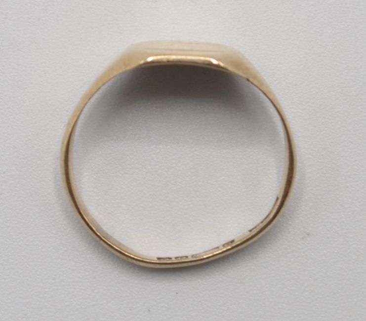 A hallmarked 9ct gold signet ring having a square head with an engraved panel. Hallmarked Birmingham 1963. Weight 1.8g. Size K.