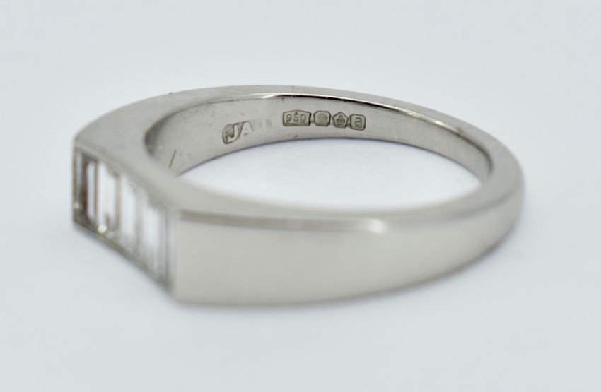 A hallmarked platinum and diamond ring. The ring set with five baguette cut diamonds to a contemporary concave setting. Estimated total diamond weight 0.50ct. Estimated clarity VS. Hallmarked for platinum. Weight 7.83g. Size M.