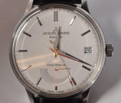 A gentleman's Jacques Lemans JL.CJ 24 jewels limited edition 16/222  automatic wristwatch. The watch having white dial with baton numerals to the chapter ring, power reserve indicator to 6 o'clock. The 24 jewels stainless steel movement set in a stainless steel case with clear glass back and black leather straps. The watch come complete with owner manual and original presentation box. Condition: good condition, used condition marks on the strap. At the time of arriving the watch was ticking and winding but sold as untested.