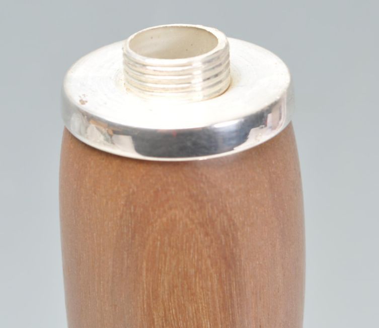 A large silver plated cocktail shaker in the form of a handheld service bell with wooden screw top handle with screw off filter and pourer. Stamped to the base. Measures 28cm tall.