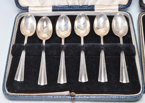 A collection of hallmarked sterling silver items comprising of six silver spoons set within a case. Bearing hallmarks for William Sucking Ltd, Birmingham, 1939. Six spoon bearing hallmarks for Harrods, London, 1940 together with a silver thimble. Bearing hallmarks for Chester,1898, John Troup & Sons. Total weight 98g