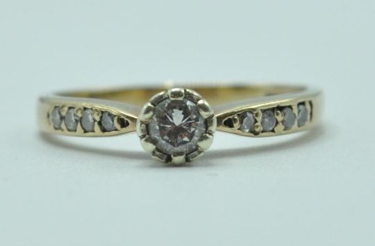 A hallmarked 9ct gold and diamond ring cathedral set with a round cut diamond with four further diamond accent each shoulder (one stone replaced with a white stone). Hallmarked Birmingham 1993. Weight 1.8g. Size M.5. Principle diamond estimated 15pts.