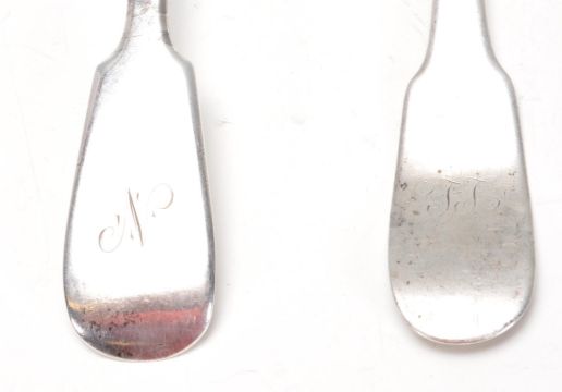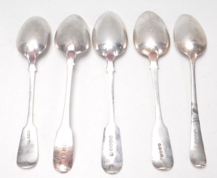 A group of five 19th century George III and Victorian silver hallmarked spoons to include a George III spoon dated 1828 London by  John, Henry & Charles Lias, George III silver spoon dated 1809 London - illegible maker, George III silver spoon dated 1823 Newcastle by John Walton, 1871 Victorian spoon by Josiah Williams & Co (James & Josiah Williams) and a 1897 Sheffield Victorian silver spoon by John Round & Son Ltd (Joseph Ridge). Weight: 328g