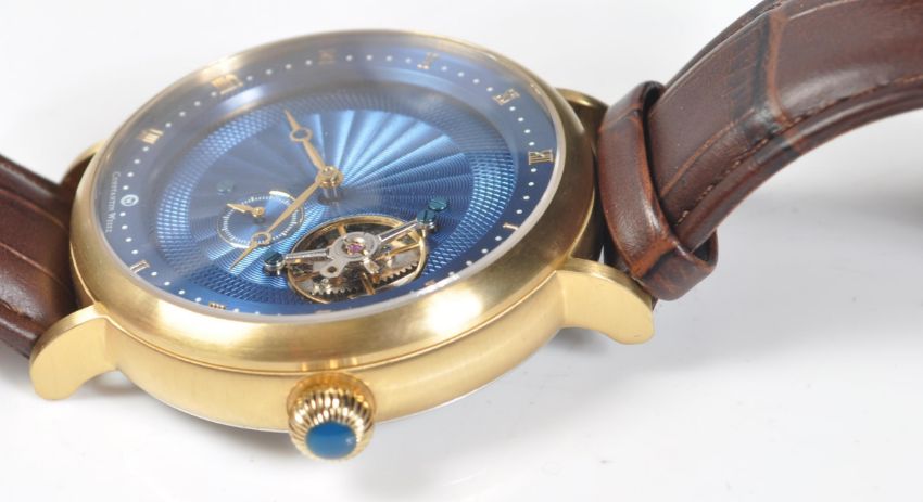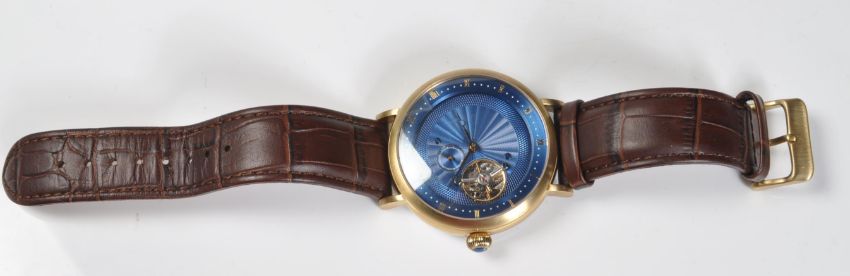 A gentleman's Constantin Weisz limited edition wristwatch model T30CW. The watch having metallic blue dial with roman numerals to the chapter ring, seconds dial and exposed tourbillon set in a stainless steel case with glass back and brown leather straps. The incredible movement and dial rotates 360 degrees inside fixed bezel. The watch come complete with owner manual, warranty and original presentation box. Condition: good condition, no visual damage. At the time of arriving the watch was ticking and winding but sold as untested.