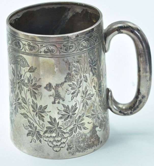 Two silver hallmarked christening cups to include a J W Tiptaft & Son Ltd example with engraved initials (hallmarked Birmingham 1932) together with a Victorian example engraved with grape vines (hallmarked Birmingham 1891), together with  pair of silver hallmarked napkin rings in their original box (hallmarked Birmingham 1899). Total weight 210g.