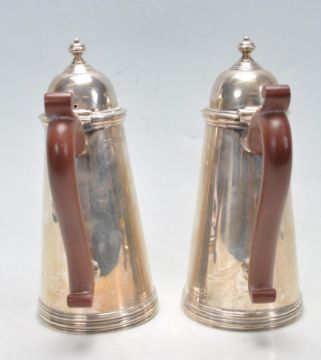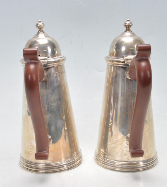 Two hallmarked sterling silver jugs having a finial top on a hinged lid with scrolled handles. One jug having a parrot beak spout and the other having a shaped spout. Bearing hallmarks for Mappin & Webb, London, 1929. Measures 17cm high. Together with a hallmarked sterling silver sugar bowl. Bearing hallmarks for Mappin & Webb, London 1927. Gross weight 713g