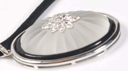An 18ct white gold pendant set with an oval reeded rock crystal panel within a black onyx border, the centre being millegrain set with nine round cut diamonds, with further diamond accent stones to the bale. Mounted on a black chord necklace. Marked 750 to the bale. Diamonds estimated 16 pts. Set within a Pickets & Pursers necklace box.