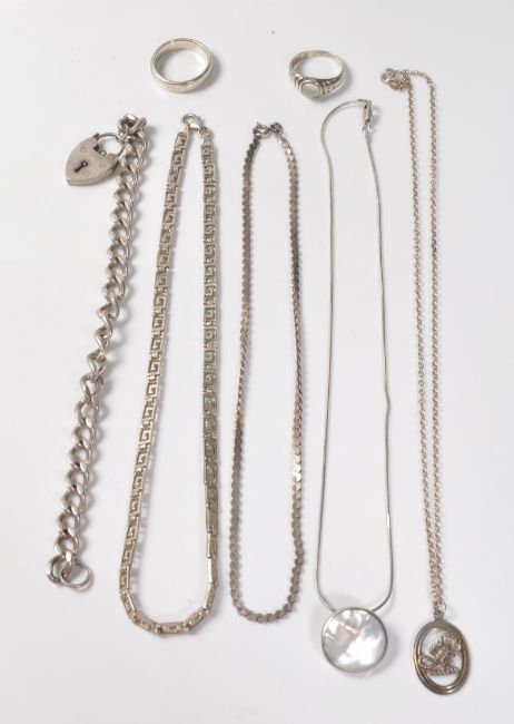 A collection of stamped silver ladies jewellery comprising of a Greek key necklace, a band ring, a Scorpio horoscope pendant necklace and a heart shaped padlock bracelet alongside a pendant necklace with faux mother of pearl panel. Total weight 65g.65g