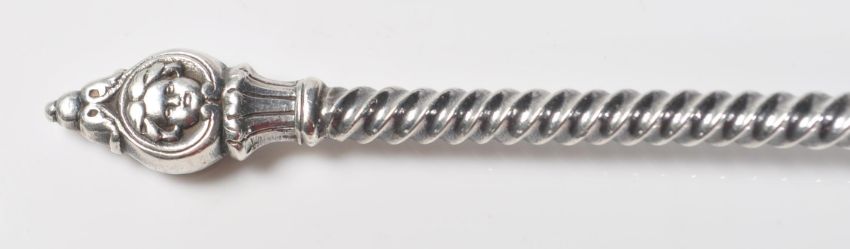 An early 20th century antique P Hertz Danish silver serving spoon having a twisted handle with putti mask finial and initial cartouche to the base of the handle. Marked P Hertz, with three tower mark and Simon Groth assay mark. Weight 78g.