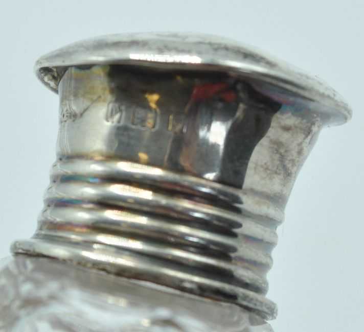 A collection of six antique 19th century and 20th century silver lidded vanity pots and bottles to include two cut glass examples, one with foliate repousse design atop the lid, another powder pot with engraved neoclassical design to the lid and a matching pair of perfume bottles. All stamped and hallmarked. Total weight of the lids 43g.