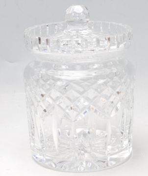 A Lismore pattern Waterford crystal biscuit barrel having a finial lid with geometric lattice decoration throughout. Comes boxed. Comes with original sticker. Measures 18cm high