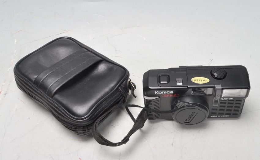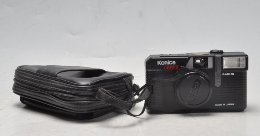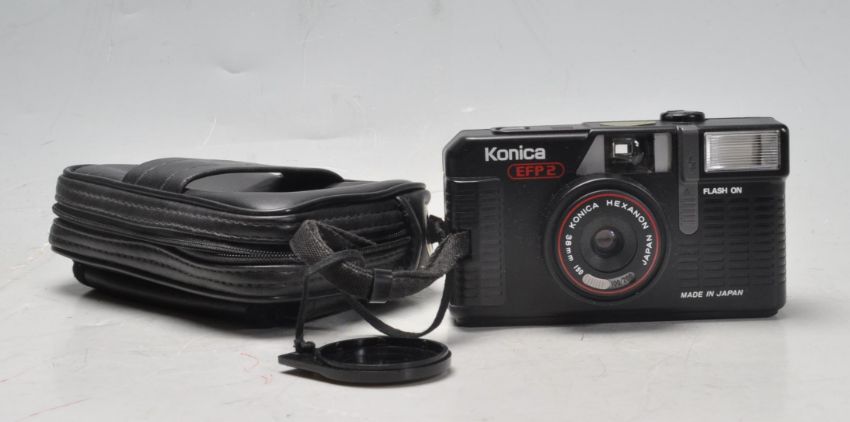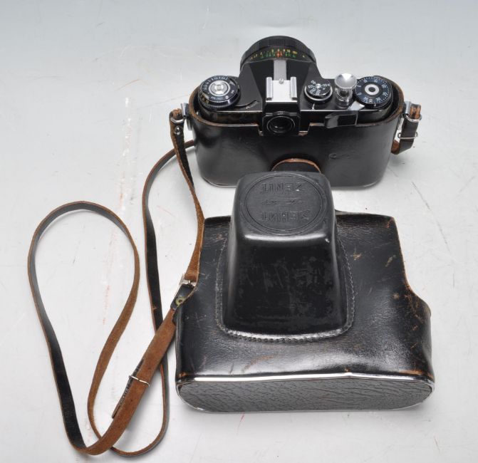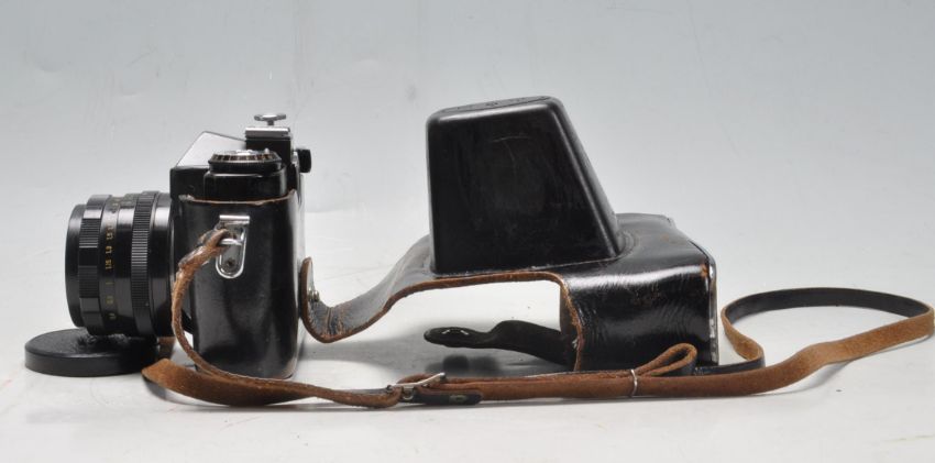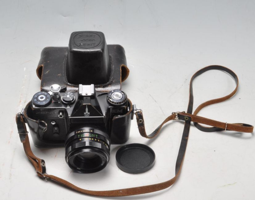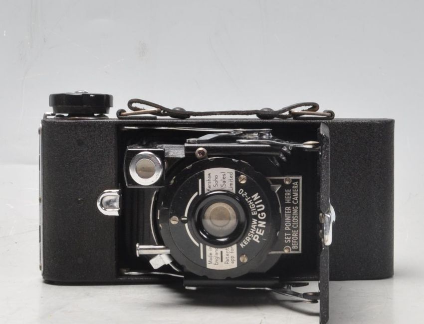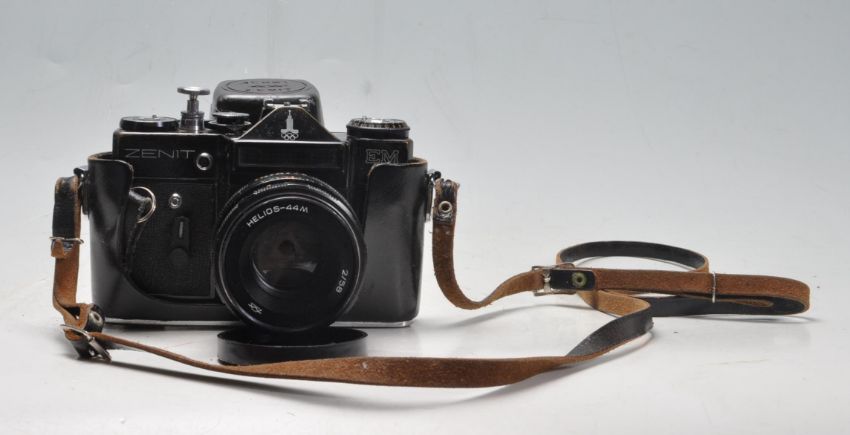 A collection of vintage 20th century 35mm camera to include a Zenit EM camera with Helios-44M 2/58 lens, Konica EFP2, Hanimex IC1300, Kershaw Eight-20 Penguin and a ICA folding camera with Kodak glass plates.