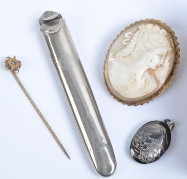 A collection of vintage jewellery and other items comprising a cameo brooch, a rolled gold tie pin, a Japanese oxidised silver locket marked ‘Sterling’, a Fattorini, Bradford cardboard jewellery box and an Edwardian electroplated bread fork.
