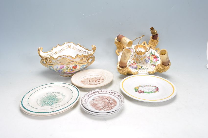 A collection of 19th century Victorian cabinet plate / commemorative plates to include three plates from Nursery P. Hymes, Hanley, two “ Poor Richard’s Maxim’s”, He Who Has Health is Young And He Is Rich Who Owes Nothing, along with a a ceramic empire style chandelier ands a central piece / bonbon dish in empire style.