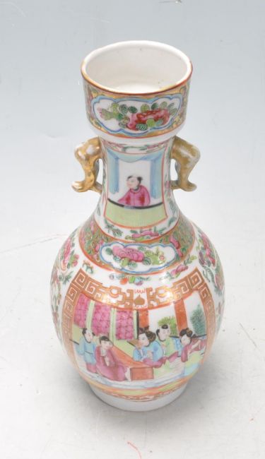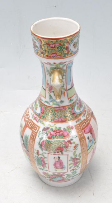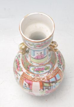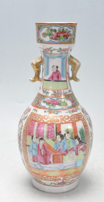 A late 19th / early 20th Century Chinese Canton famille rose vase decorated with narrative court scenes to the sides, decorated throughout with florals, having moulded gilt handles. Unmarked to the base. Measures 26cm tall. Appears in good condition for its age, some wear to the gilt and enamels in places, particularly to the handles.