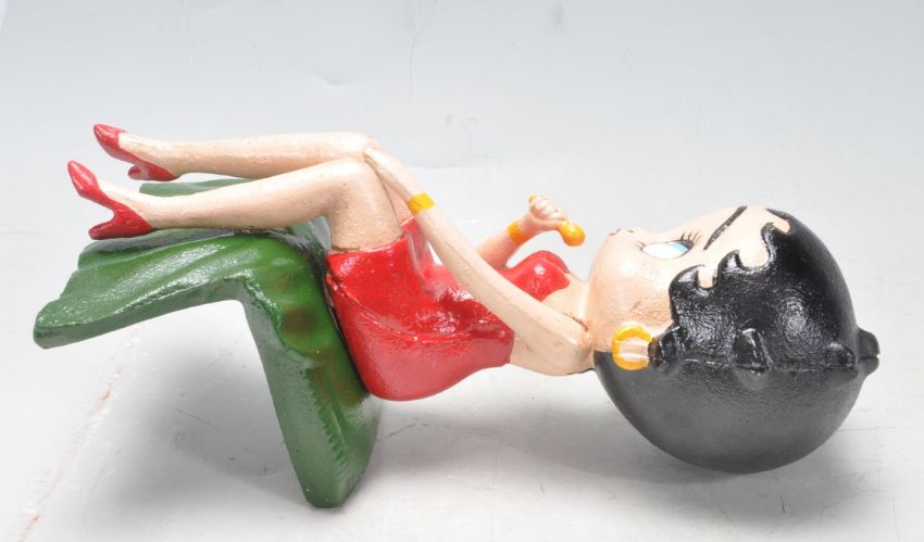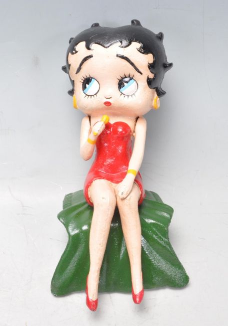 A vintage style cast iron polychrome figurine in the form of Betty Boop in a seated position holding a microphone. Measures 27cm high.