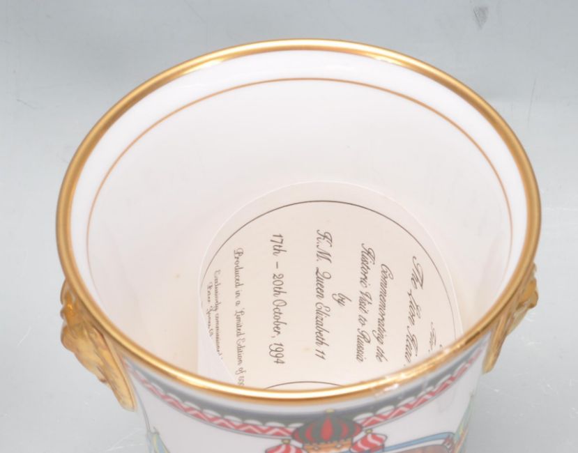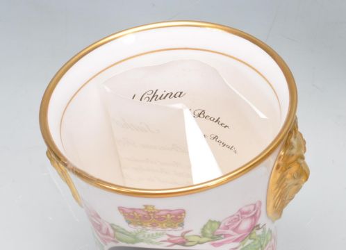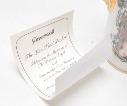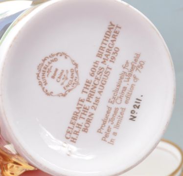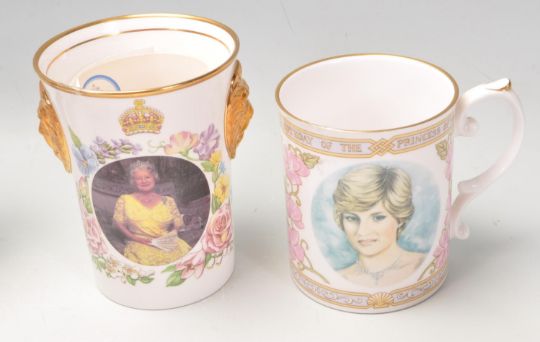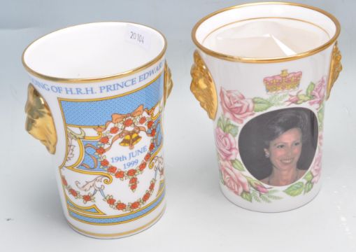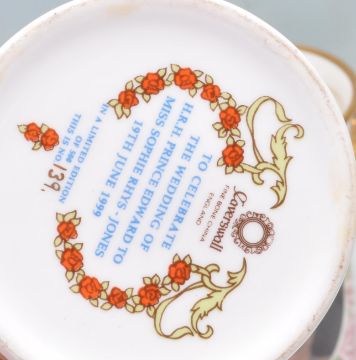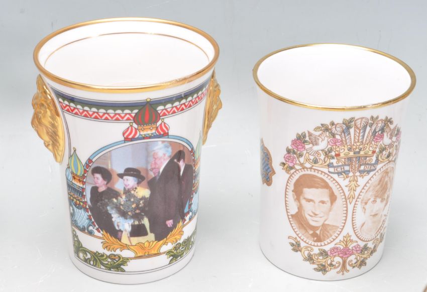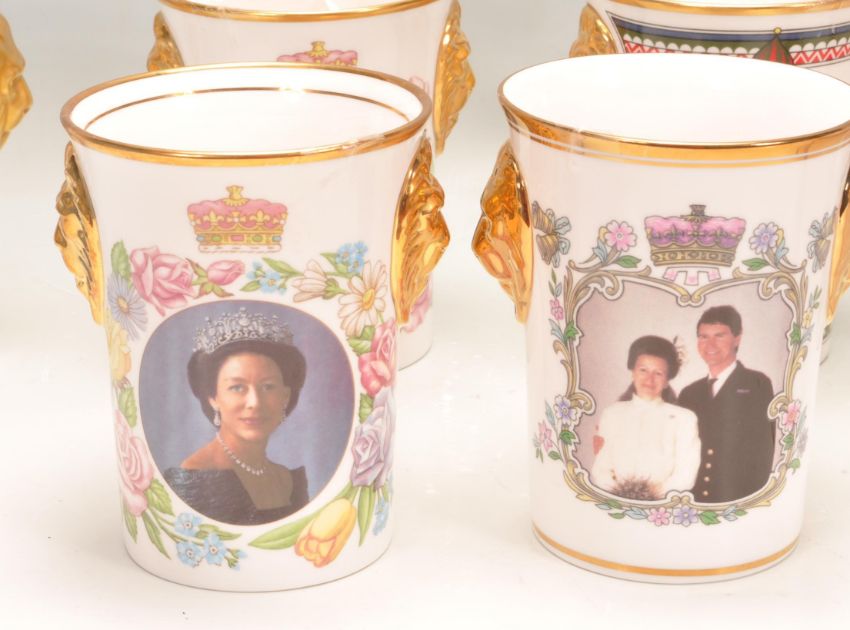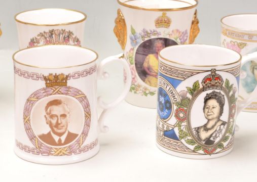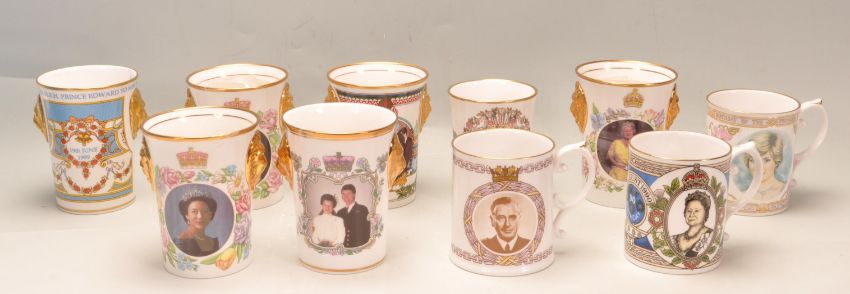 A collection of ten vintage 20th century ceramic Royal commemorative ware cups to include a limited edition Sutherland bone china cup celebrating the Queens visit to Russia, a limited edition Coverswall Bone china cup for the marriage to Prince Edward to Miss Sophie Rhys Jones and more. All produced exclusively for Peter Jones China Wakefield. No visible damage. Measures 12cm tall.