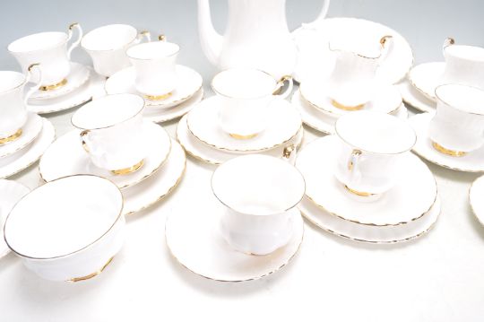 A vintage 20th century Royal Albert Val D'or tea service to include tea cups, saucers, and coffee pot all having gilt handles and rims.