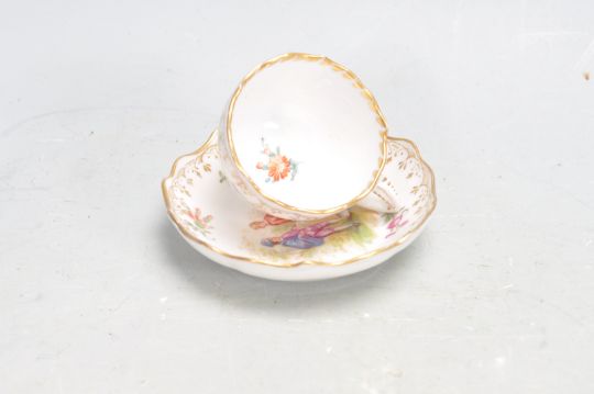 A collection of antique early 20th century china ceramics to include a  Sevres porcelain hand painted cabinet plate having a central panel with a young girl and a bird. Together with a finely hand painted miniature cup and saucer depicting a courting couple. Together with with two other ceramic figures. One having a Chelsea gold anchor to the back of the base.
