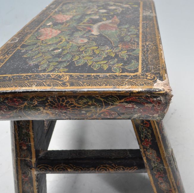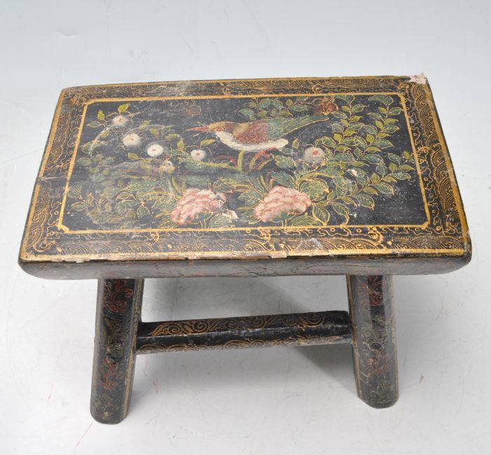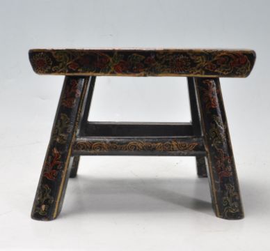 A vintage 20th century folk art ebonised wooden stool having gilt detailing with floral decoration throughout. Signs of wear and tear commensurate with its age. 18cm x 24xm x 16cm
