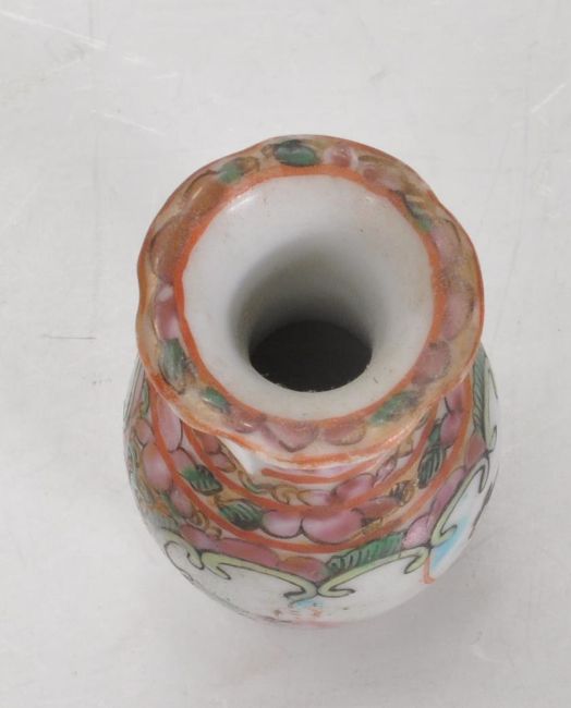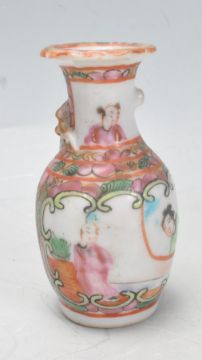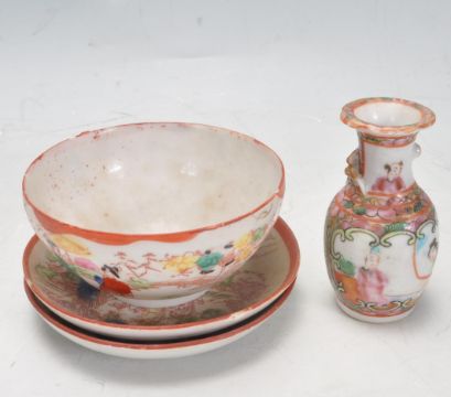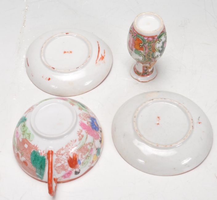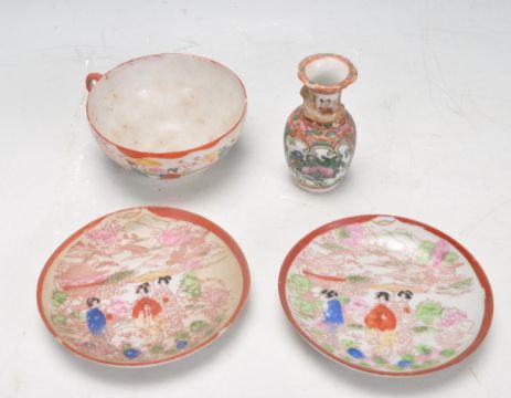 A collection of 19th century antique Chinese oriental ceramic porcelain ware to include two small plates and a cup. All being decorated with a landscape view and people scene. Red makers marks on the back of the plates along with a small vase decorated with people scenes and floral panels along with a small hand crafted table mat.