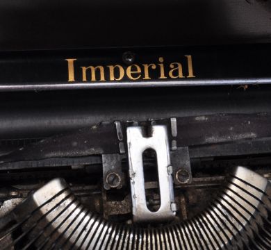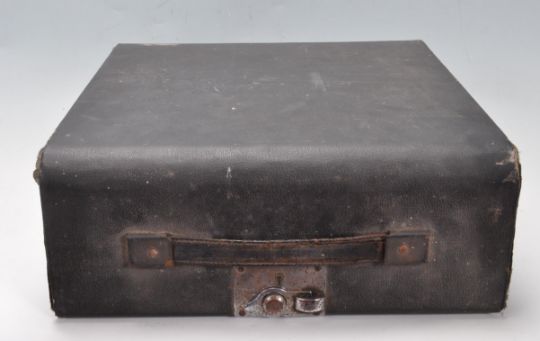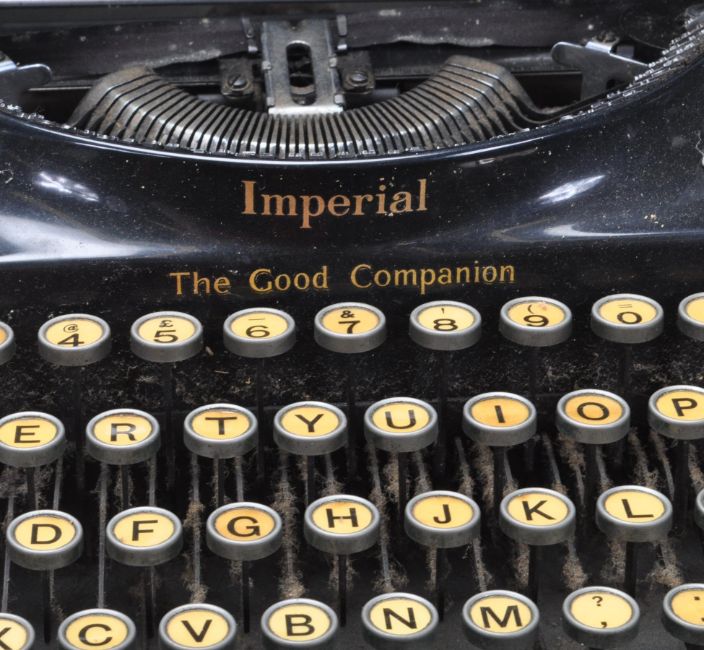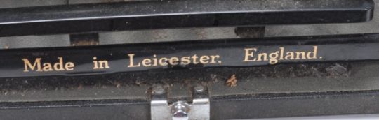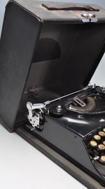 A vintage 20th century Imperial The Good Companion portable typewriter having a black frame with gilt detailing. Comes in hardcover carrycase with carry handle to the side.  Stamped Made in Leicester, England