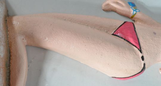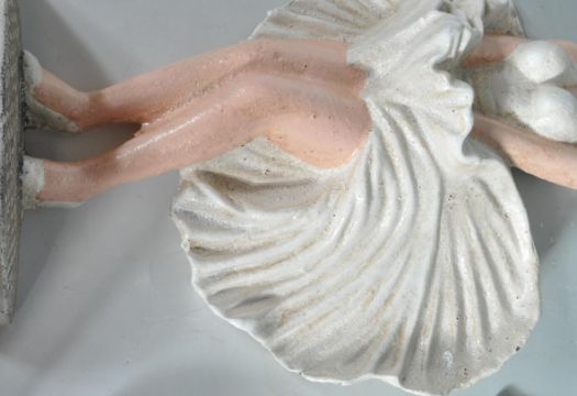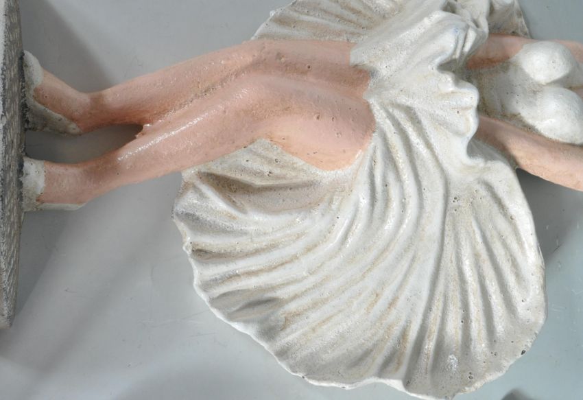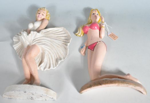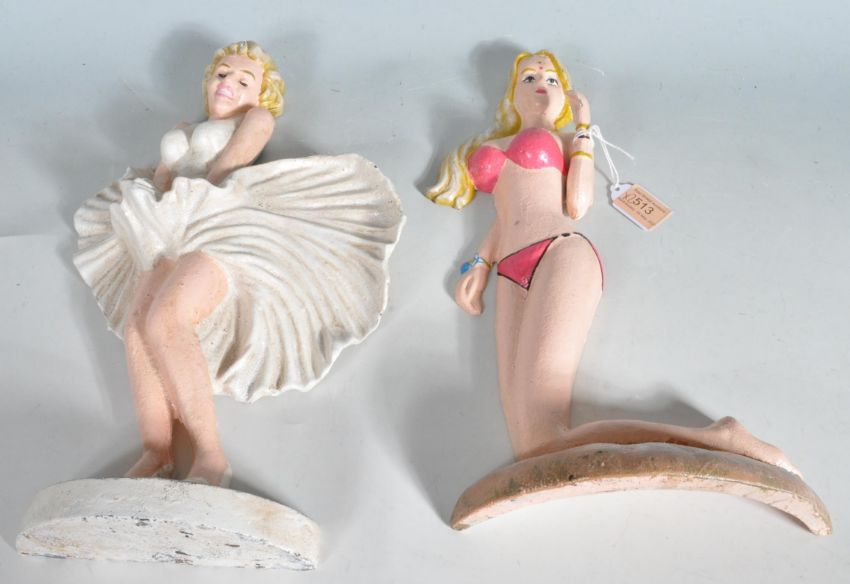 Two vintage style cast iron doorstops in the form of Marylin Monroe and Valeria. Both having polychrome decoration with naturalistic bases. Measures approx.: 35cm high.