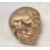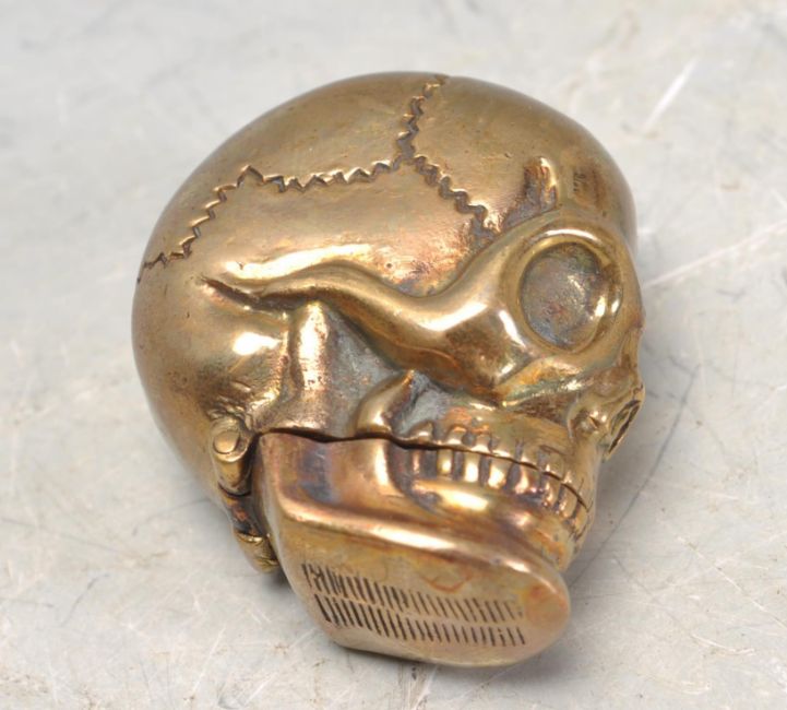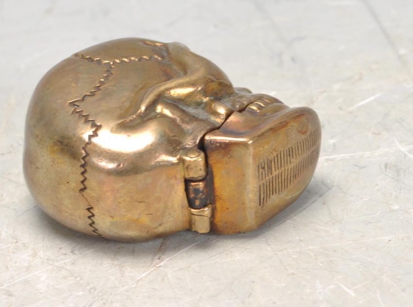 A brass vest case in the form of a skull with hinged lid at the jaw and match strike beneath. Measures 4cm tall.