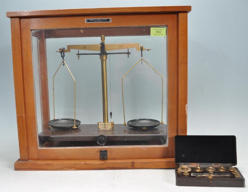 A vintage retro 20th century balance scale / laboratory scales by Griffin & George LTD.  The scale having brass arms and column with Bakelite trays and base set in a wooden case with glass panels complete with a W & J George & Becker LTD weights.