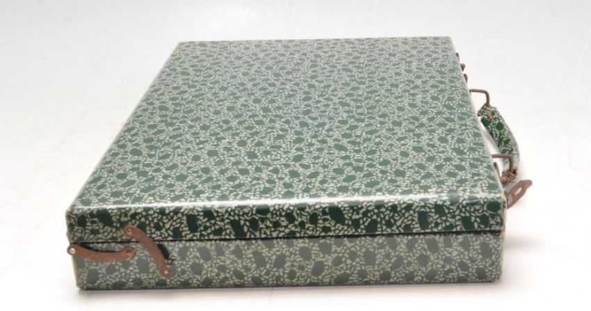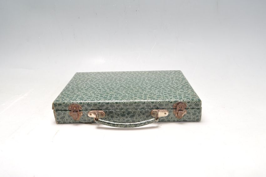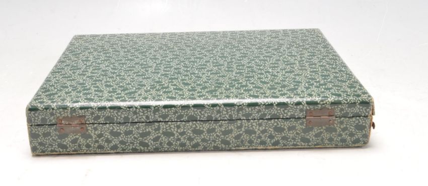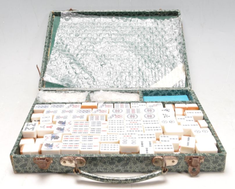 A 20th century vintage Chinese Mahjong game set complete with white counters with character marks and symbols atop and bamboo to the underside. Held within a green carry case. Measures 20cm x 26cm x 4cm.