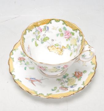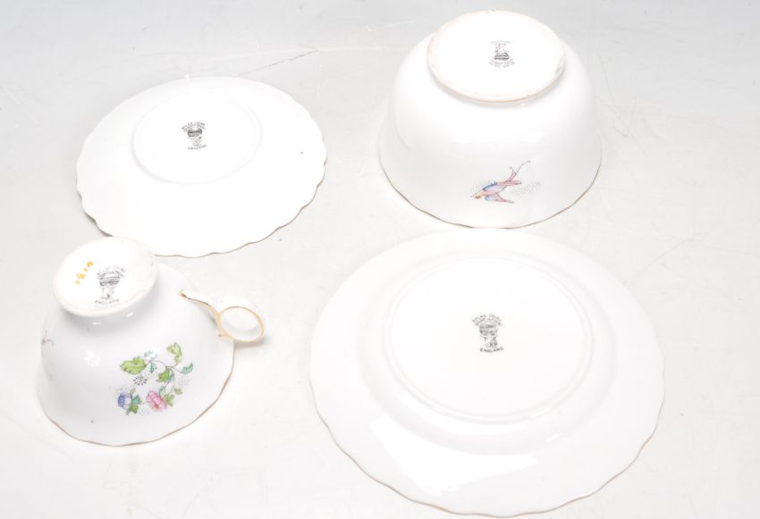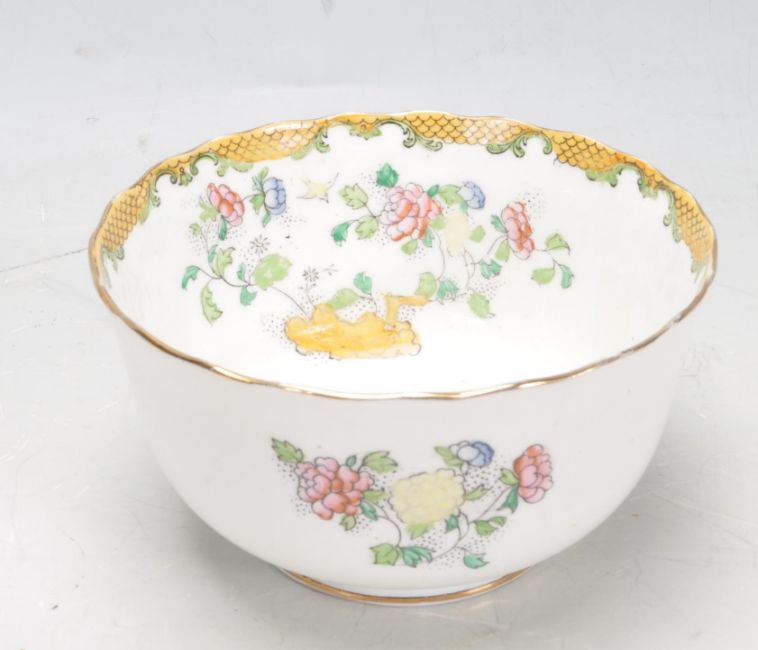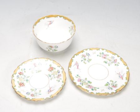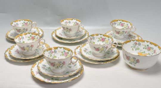 An early 20th century Atlas China tea set by Grimwade comprising of six cups, six saucers and six cake plates (trios) together with a sugarbowl. The tea set has polychrome botanical decoration with gilt embellishments. Smalls signs of wear and tear commensurate with its age.
