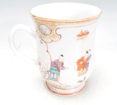 An antique large Chinese period Qianlong porcelain famille rose hand painted cup / beaker having family scenes to the side with geometric patterns to the base. Measures 15cm high. Signs of wear and tear commensurate with its age.