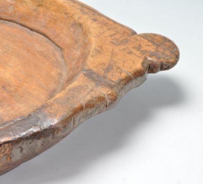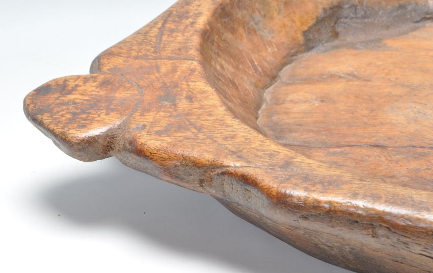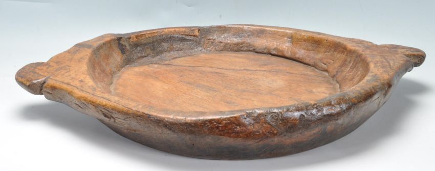 An early 20th century North European rustic carved wooden serving bowl of circular form having twin handles and raised edges. Measures 57cm wide