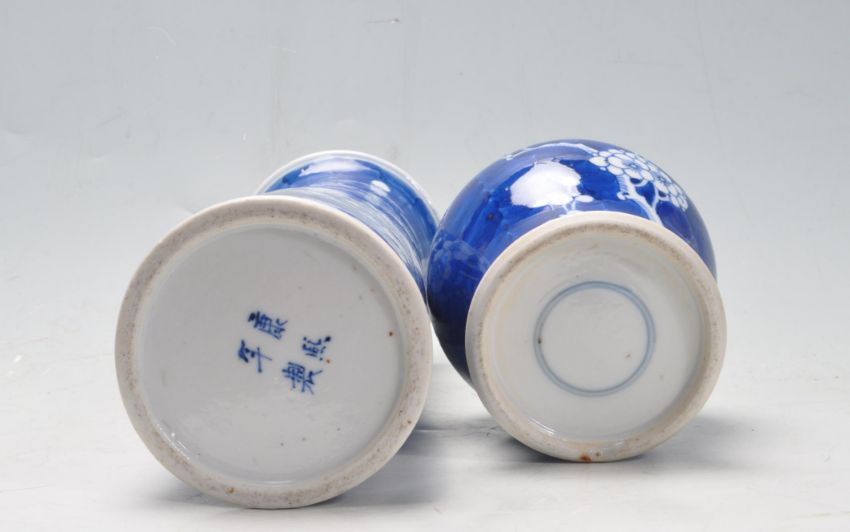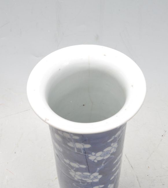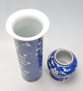 A 19th century Chinese oriental ceramic porcelain sleeve vase of cylindrical form with shaped rim in prunus with blue Chinese character marks underside along with a 19th century Chinese oriental ceramic porcelain baluster pot in prunus pattern. Measures: 26cm tall.