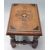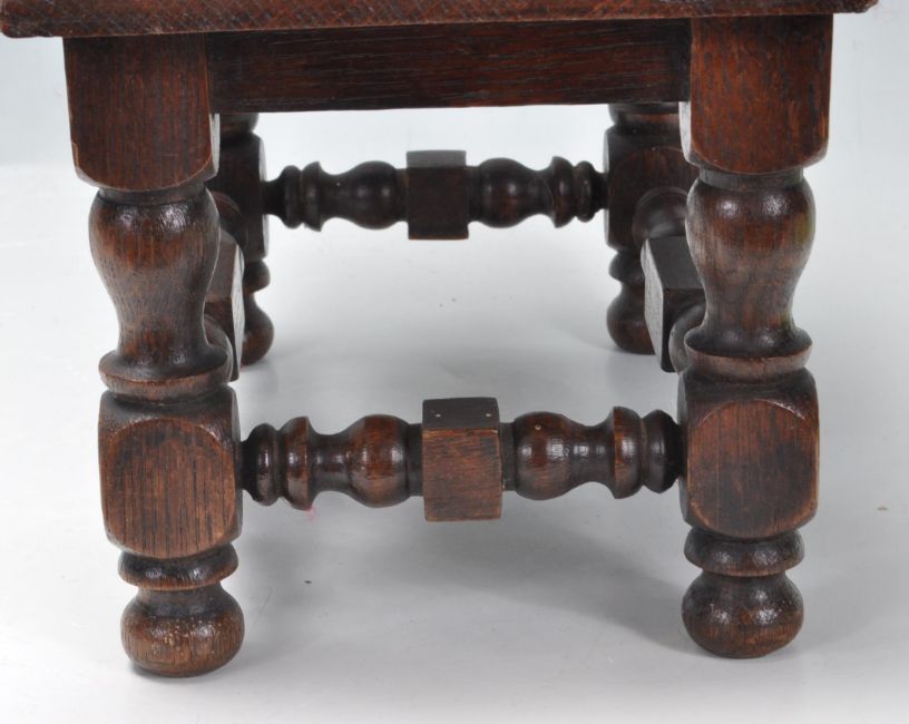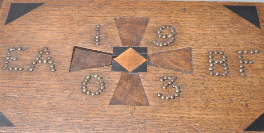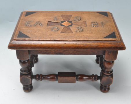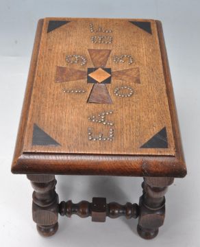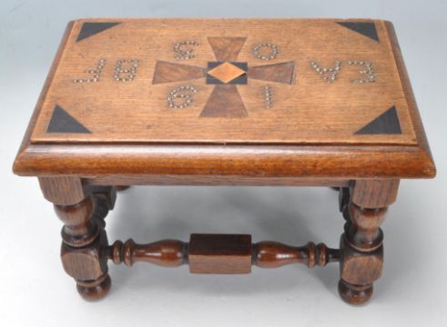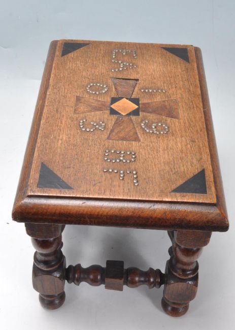 An early 20th Century Edwardian oak small stand likely to commemorate a marriage having inlaid decoration with riveted detailing with initials EA & BF dated 1903, raised on turned and block supports with stretchers. Measures 28 x 27 x 18cm.